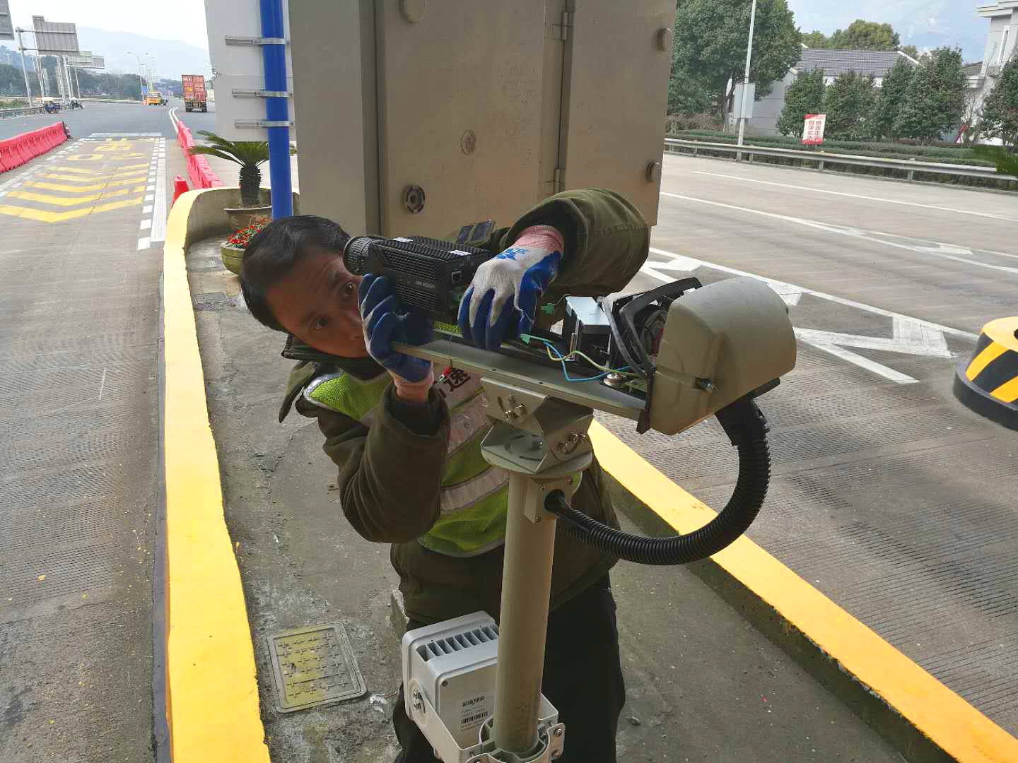 圖為廠家人員在調(diào)試設(shè)備 公司路段人工車道車牌抓拍識別系統(tǒng)已于去年全部更新?lián)Q代,而ETC車道因當(dāng)時還尚能滿足收費條件沒有更換。但隨著收費系統(tǒng)不斷升級,當(dāng)切換人工收費,要求錄入全部車牌時不僅效率低,而且容易出錯,嚴(yán)重影響了收費操作速度。 公司工程養(yǎng)護(hù)部機(jī)電設(shè)備維養(yǎng)中心發(fā)現(xiàn)這一問題后,立刻聯(lián)系了車牌抓拍設(shè)備廠家,并在設(shè)備到位當(dāng)天,中心隊員就著手安裝和接線工作,方便廠家人員后續(xù)調(diào)試,以便盡快啟用自動車牌抓拍系統(tǒng)。因調(diào)試過程涉及到與軟件方配合,中心隊員便一起協(xié)助廠家溝通聯(lián)系,加班加點已成常態(tài)。經(jīng)過雙方近十天努力,一套集車牌抓拍、高清視頻于一體的監(jiān)控設(shè)備佇立在車道安全島上。 自動車牌抓拍系統(tǒng)的成功安裝,不僅提升了收費操作速度,還可以隨時掌握每輛車經(jīng)過的點位及高清圖片,減少車輛違法行為,在打擊車輛偷逃通行費等方面也將起到積極作用。 項寅曉