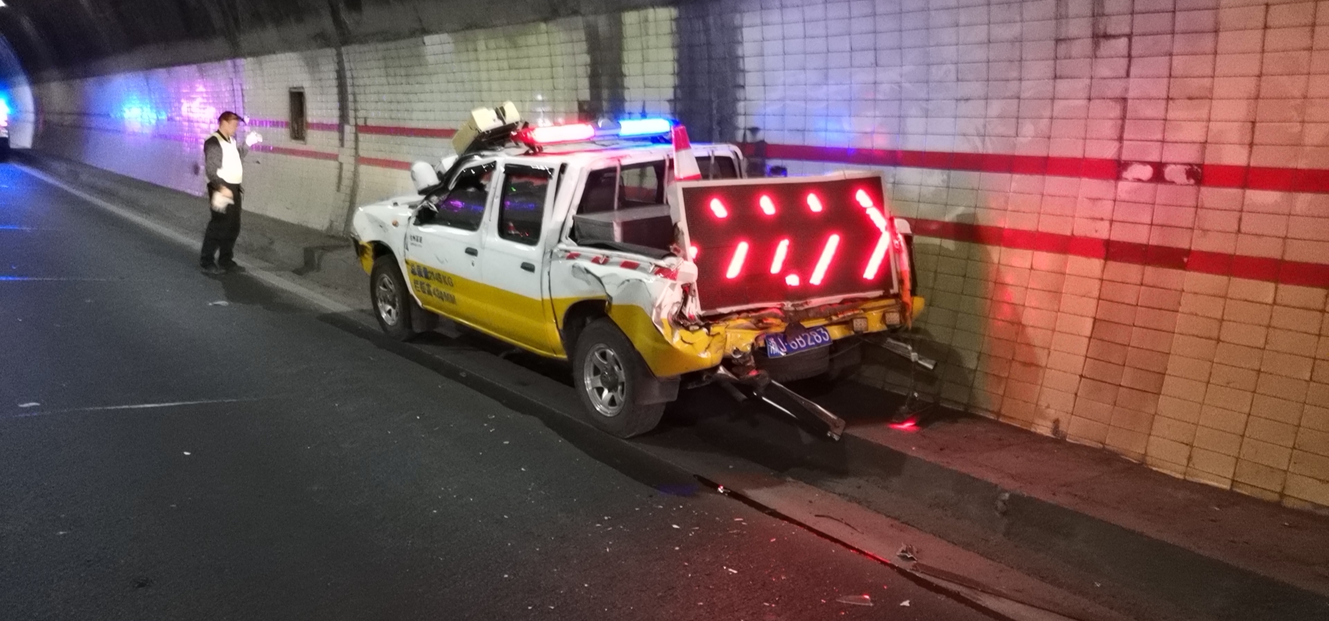 圖為事故車輛 憑著多年積累下來的經驗,洪瑞立刻判斷該車肯定存在異常情況,趕緊使用巡邏車內的廣播反復呼叫,提醒貨車靠邊停車檢查,并將此情況反饋到中控室。然而貨車并未停下,為了確保貨車的安全,巡邏車開啟警示燈,拉起警報,給該車預警。 當車行駛到馬鬃嶺隧道時,執勤隊員從后視鏡發現后方有另一輛大貨車正快速逼近,沒有任何減速的傾向。這一刻,留給他們的只有兩個選擇:往左拐,時間緊張,一個處置不當,會出現尾部被撞后再次追尾前方貨車的前后夾擊險情,后果不堪設想;或者在被撞時的一瞬間采取正確的應對措施,在操作時絕不能有一丁點的遲疑,逃生的時機僅有幾秒鐘。 生死存亡的緊急關頭,隊員們及其冷靜,被猛烈撞擊時,沒有急踩剎車、誤打方向,在左側車道有車的情況下,處置正確、分毫不差,往右車道偏移了10來米,成功從夾縫中逃脫,化解了這次險情。巡邏車被撞后,兩名受傷隊員不顧傷痛,仍然堅持下車保護現場并對來往車輛預警,預防二次事故的發生,直到后續救援力量到達。 此次事故造成三車追尾,兩名執勤隊員輕微受傷,雖然巡邏車損失慘重,但是因為執勤隊員高度的工作責任心和對險情的正確判斷處置,才未造成任何司乘人員的傷亡,也未影響到隧道正常通行。 據隧道所員工了解,該貨車司機可能是凌晨疲勞駕駛沒有聽見巡邏車預警,在此提醒廣大司機,車輛如果發生故障,車靠邊、人撤離,即報警,切忌疲勞駕駛! 盧祖理
