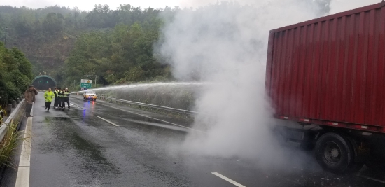 隧道外突發火情,執勤隊火速救援 11月23日上午09:15分,一陣急促的警鈴聲響起,大溪嶺北情報板附近硬路肩有一集裝箱貨車車頭起火,執勤三隊隊長剛好在中控室,迅速組織執勤隊員趕往現場。